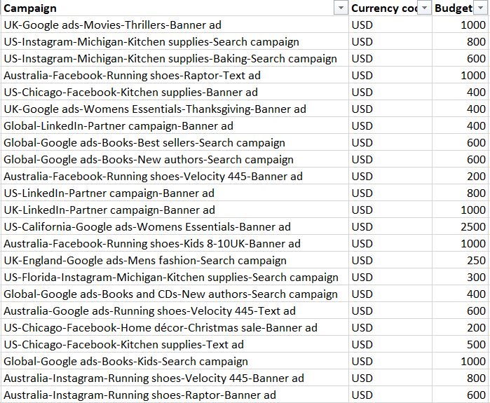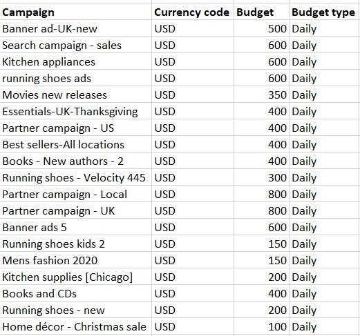 Here is how an export of your Google ads campaigns would look like if they have non-standard naming conventions.